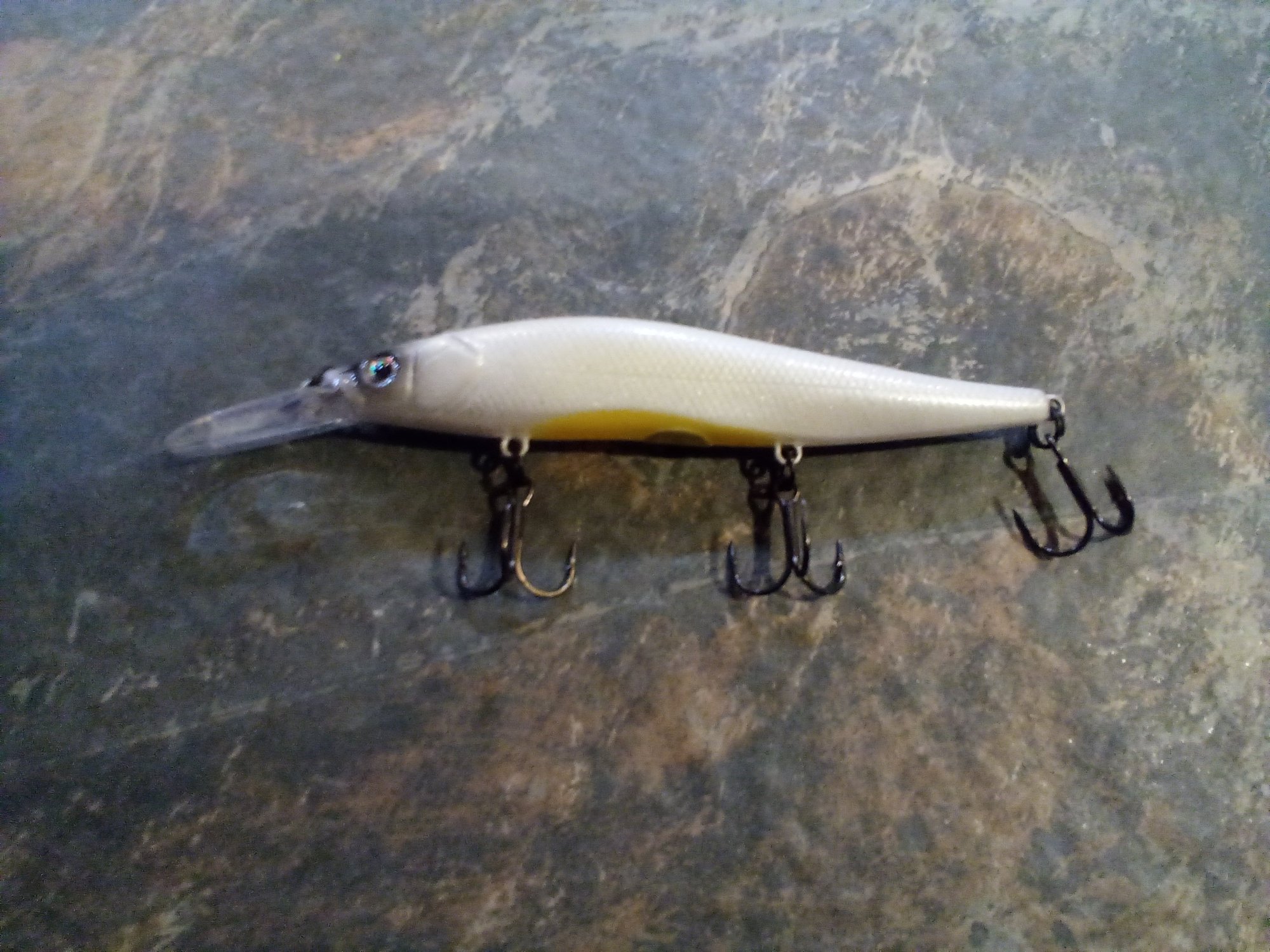 Custom painted 110+1 KO with VMC hooks. The lure is weighted to rise very slowly.